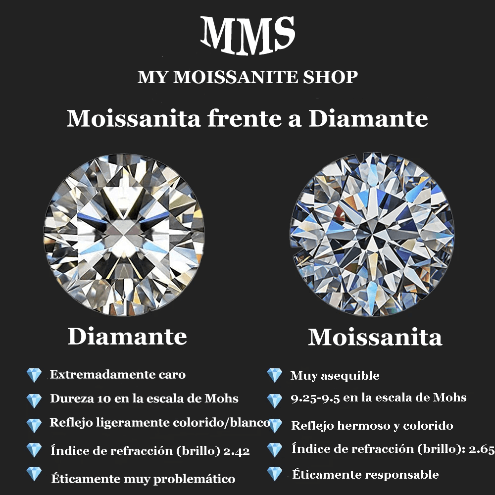 La única diferencia perceptible es un reflejo de la luz ligeramente más brillante y presente en la moissanita. ¡Y este brillo es precisamente lo que hace que un diamante sea tan preciado para muchos!