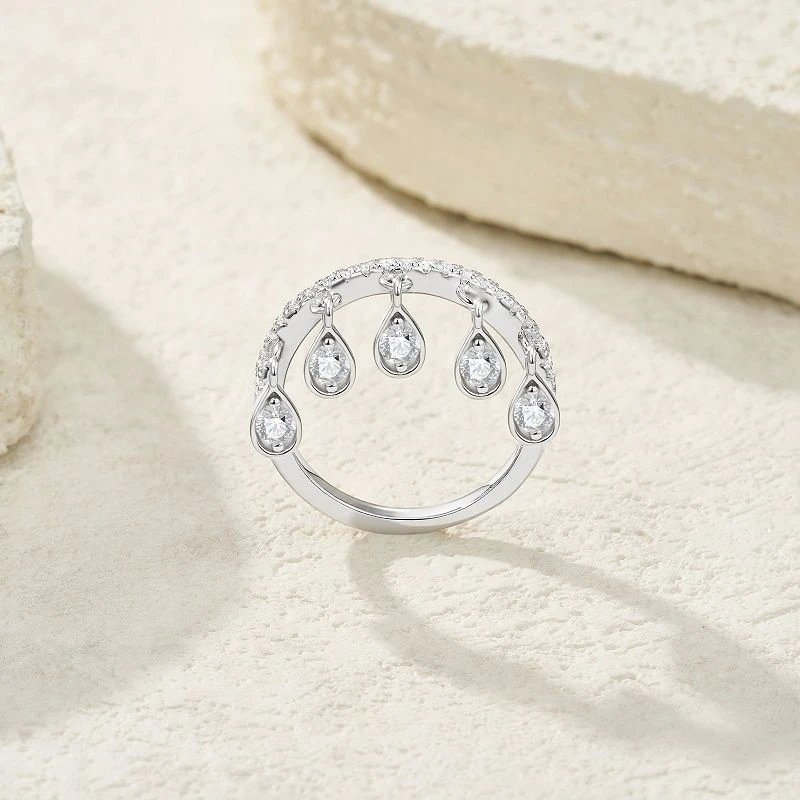 Anillo de moissanita con flecos en plata S925, hipoalergénico y resistente al deslustre. La moissanita verificable ofrece un brillo intenso, perfecto como regalo de aniversario o detalle especial.